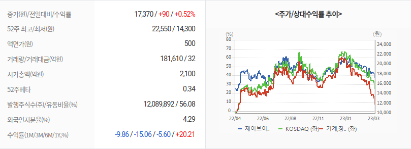 2023년 03월 31일 기준으로 제이브이엠의 주당 가격은 17,370원 입니다.